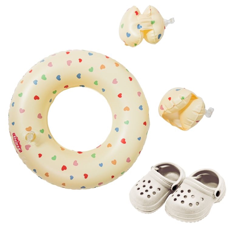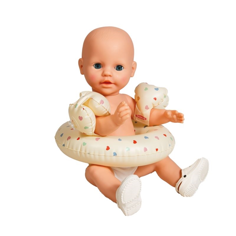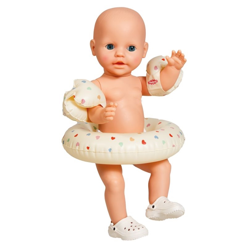 Det kan være praktisk at få alle tre dele samlet i ét sæt. Badeskoene er lavet af EVA, som er et let materiale, der kan tåle vand. Badevingerne og baderingen har det samme søde hjerte-mønster, så det hele matcher. Dit barn kan nemt tage det hele med, når dukken skal med i legen ved vandet eller i badekarret derhjemme.