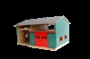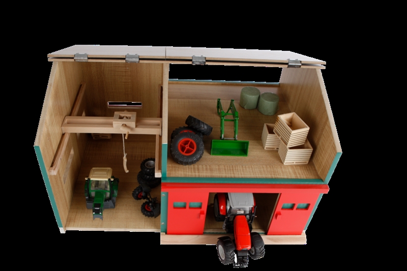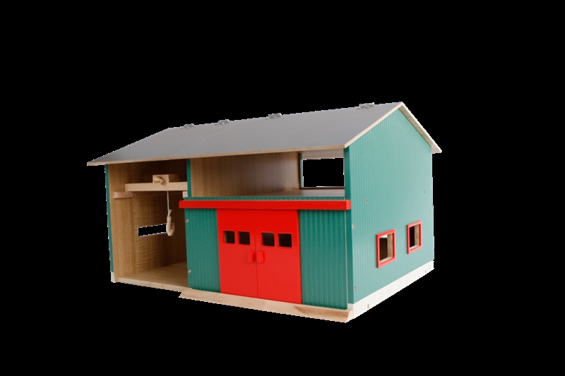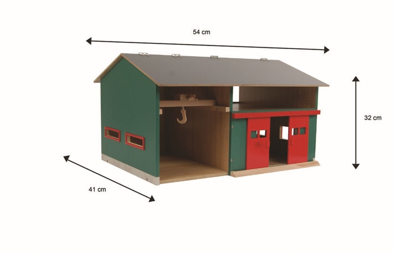 Velkommen til Kids Globe Maskin- og Foderhus, hvor dit barn kan skabe sine egne historier om livet på landet. De røde skydedøre åbner op til et rummeligt indre, hvor traktorer og maskiner kan køre ind og ud. Huset byder på forskellige rum til opbevaring af foder og redskaber, mens den grønne facade giver en ægte landlig stemning.