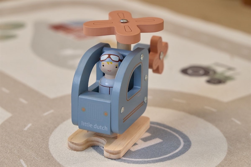 Har du lyst til at flyve højt over skyerne? Med denne søde blå helikopter fra Little Dutch kan dit barn udforske verden fra luften. Helikopteren har orange rotorer, der drejer rundt, og en lille træfigur i pilotuniform kan sidde i kabinen. Dit barn kan lade piloten flyve på opdagelse, lande på legepladsen eller redde dyr i nød. Helikopteren kan bruges alene eller sammen med andre legetøjsbiler og en legeplade. Den simple konstruktion gør det nemt for små hænder at gribe om helikopteren og skubbe den rundt, mens fantasien får frit løb.