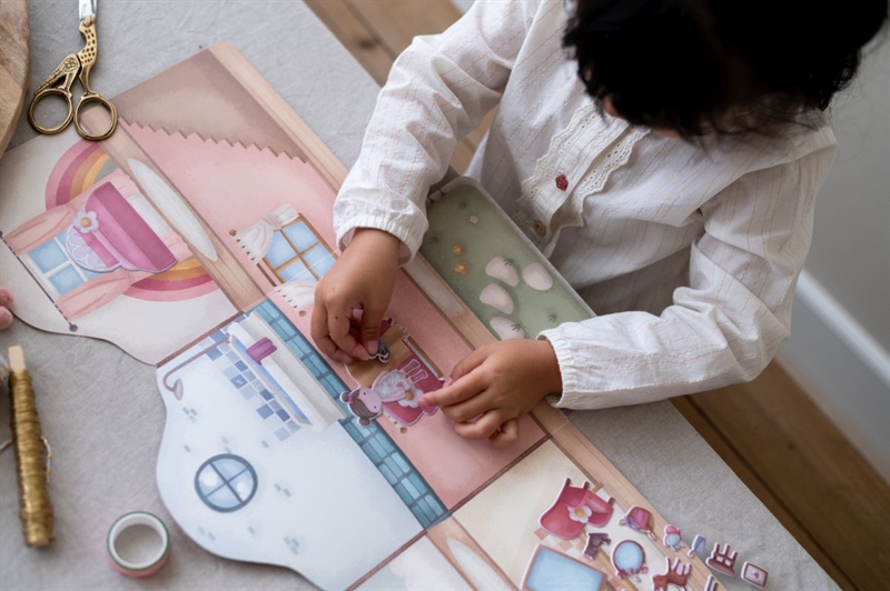 Har du lyst til at indrette dit eget lille hus? Med denne fine klistermærkebog i rosa fra Little Dutch kan du skabe dine egne historier, rum for rum. Bogen har et charmerende husformet design med farverige illustrationer, der inviterer til timevis af kreativ leg. Over 60 genanvendelige klistermærker kan placeres på forskellige scener, der forestiller rum i et hus – fra stuen til køkkenet. Klistermærkerne er fremstillet af robust papir, som er nemt at påføre og fjerne, så du kan ændre indretningen igen og igen.