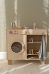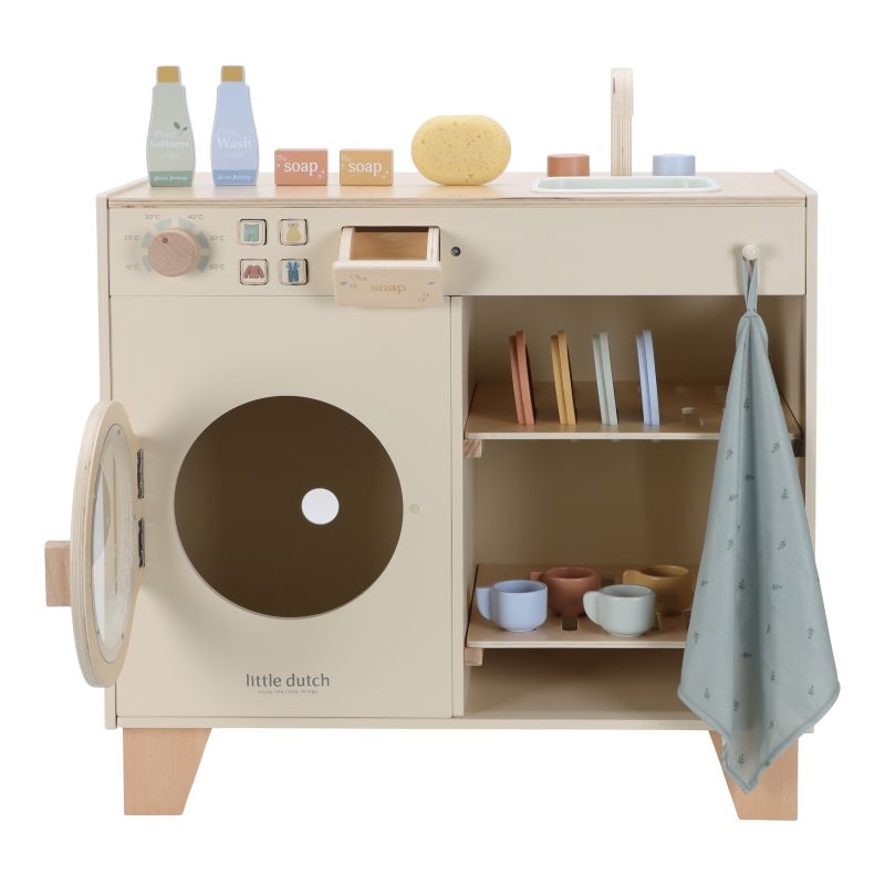 Har du tøj, der skal vaskes? Med denne vaskemaskine fra Little Dutch kan du vaske alle dine dukkekjoler og bamsetøj, ligesom de voksne gør det. Åbn den runde dør, læg tøjet ind, og drej på knapperne. På toppen af maskinen finder du sæbeflasker og sæbebarer, så du kan lade som om, du fylder vaskemiddel i. Ved siden af maskinen er der hylder til kopper, tallerkener og underkopper. Her kan du opbevare dit legetøj, når vasken er færdig, og lege videre med at dække bord.