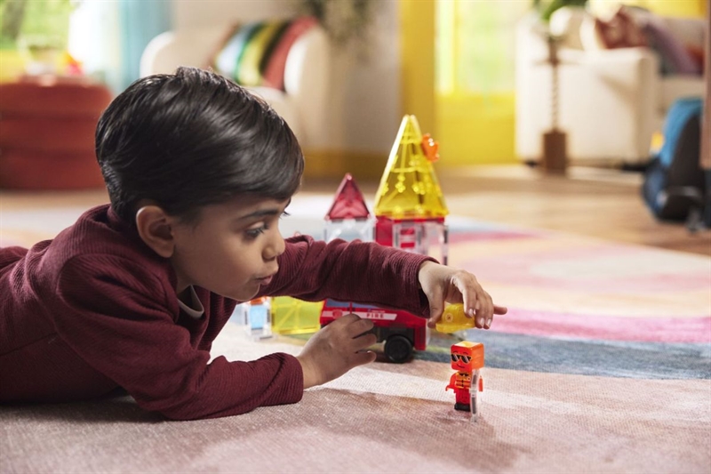 Med denne Magna-Tiles brand- og redningsstation kan du og dit barn skabe spændende redningsaktioner. Sættet indeholder en brandbil med Pull Back & Go-funktion, der kan køre ud på nye missioner. De farverige magnetiske brikker gør det nemt at bygge stationen præcis, som I vil have den. En lille brandmand med hjelm står klar til at rykke ud, når alarmen lyder.