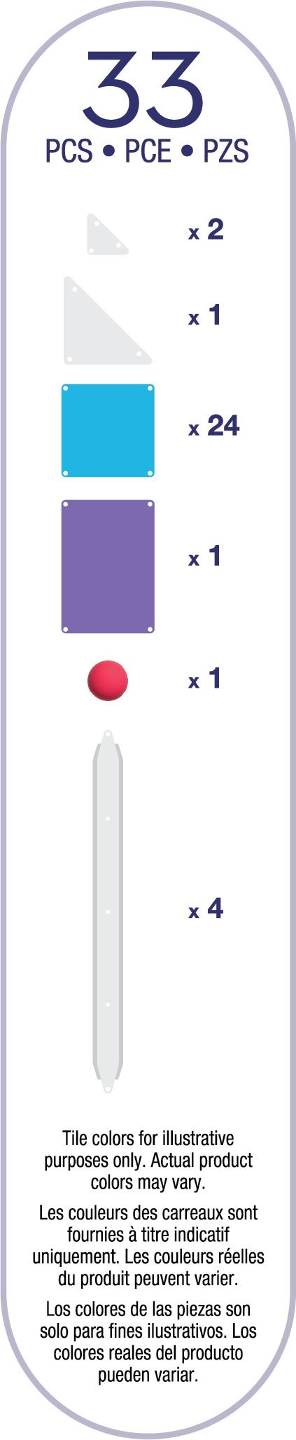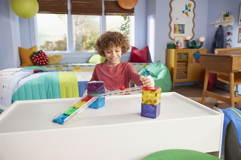 Med Magna-Tiles kuglebane kan du og dit barn udforske fysikkens verden gennem sjov og leg. De 33 farverige, gennemsigtige dele kan nemt klikkes sammen til spændende baner, hvor I kan eksperimentere med forskellige højder og vinkler. Kuglens bevægelse ned ad banen kan inspirere til samtaler om tyngdekraft og fart.