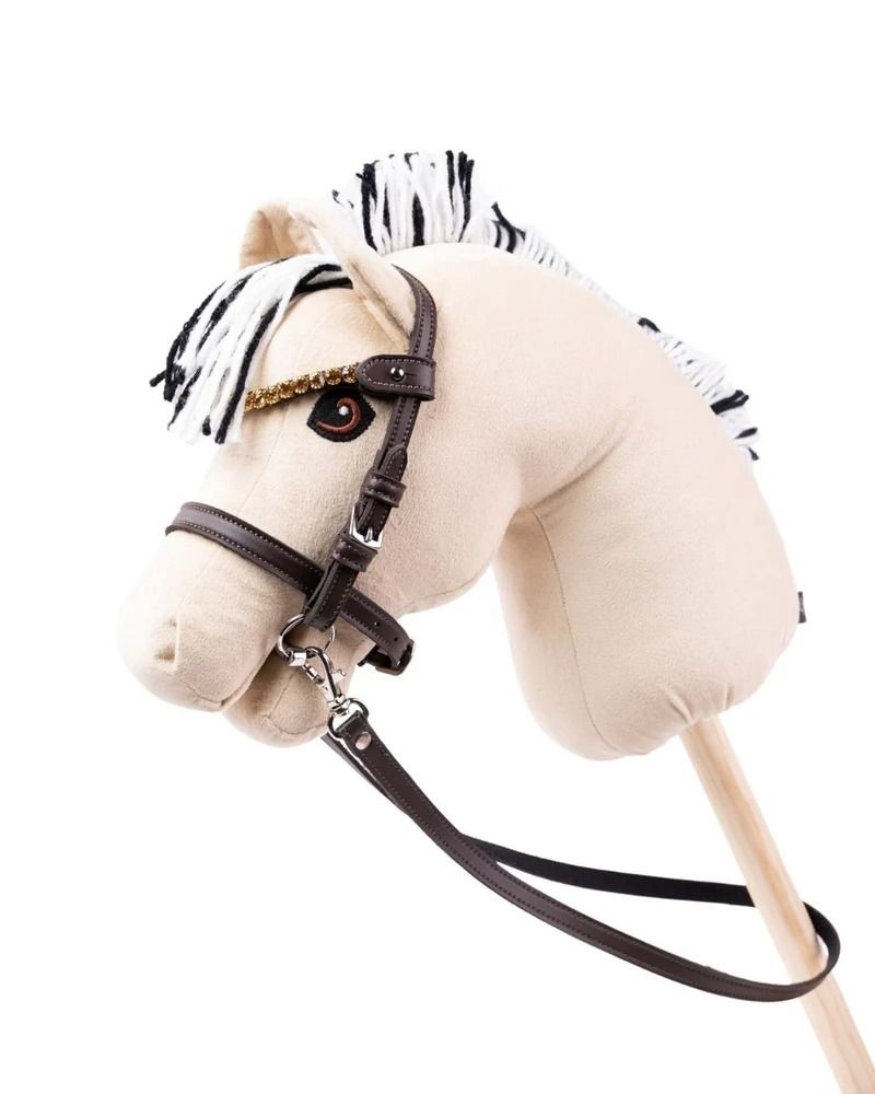 Har du en kæphest, der trænger til flot udstyr? Denne brune trense fra My Hobby Horse er håndlavet og giver din kæphest et unikt udtryk. Pandebåndet er pyntet med skinnende sten i gyldne nuancer, der fanger lyset, når du rider. Trensen er lavet af slidstærkt materiale med justerbare spænder, så den kan tilpasses din kæphest. Tøjlerne kan nemt tages af og på, og de giver dig god kontrol, når du rider. Trensen inkluderer et originalt My Hobby Horse-bid.