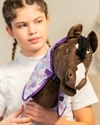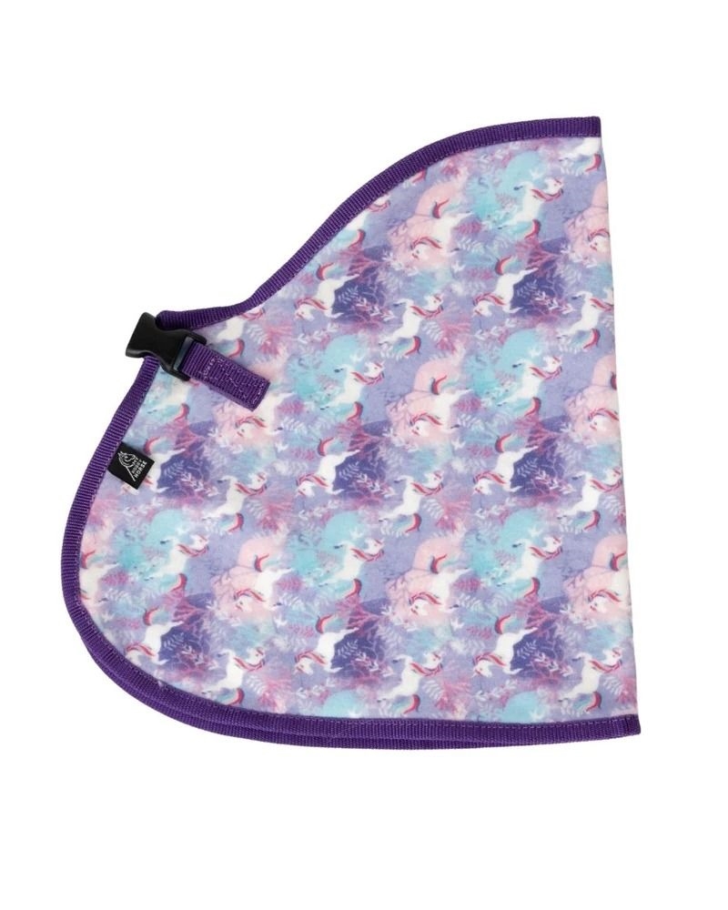Unicorn-printet gør dette fleecedækken til noget helt særligt for dit barn. De bløde pastelfarver i lyserød, lilla og lyseblå skaber et drømmende udtryk, som kan inspirere til kreativ leg med kæphesten. Den lilla kant følger hele dækkenets kant og giver et sammenhængende look. Når din kæphest står i stalden med dette dækken på, kan det tilføje en personlig og sjov detalje til dit barns hobbyhorse-udstyr.