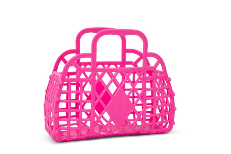 Denne Mini Retro Taske fra Sun Jellies har et charmerende gitterdesign med diamantformet mønster i en klar pink farve. Tasken kan nemt tørres af og genbruges, hvilket gør den praktisk til stranden, legepladsen eller sommerudflugter. Den er lavet af 100 % genanvendeligt LDPE, så du kan bruge den igen og igen. Med en vægt på kun 0,06 kg er den let for dit barn at bære rundt, og de buede håndtag gør den behagelig at holde i.