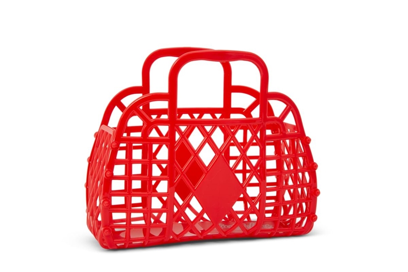 Sun Jellies Mini Retro Taske i levende rød er lavet af 100 % genanvendeligt LDPE, hvilket gør den holdbar og miljøvenlig. Tasken kan tørres af og genbruges igen og igen, så den holder til leg ved stranden, i parken eller på farten. Med mål på 15 x 13 x 7 cm har den plads til det nødvendige, mens vægten på kun 0,06 kg gør den let at bære for små hænder. Det karakteristiske gitterdesign med diamantformede mønstre bringer et strejf af nostalgi til børns hverdag.